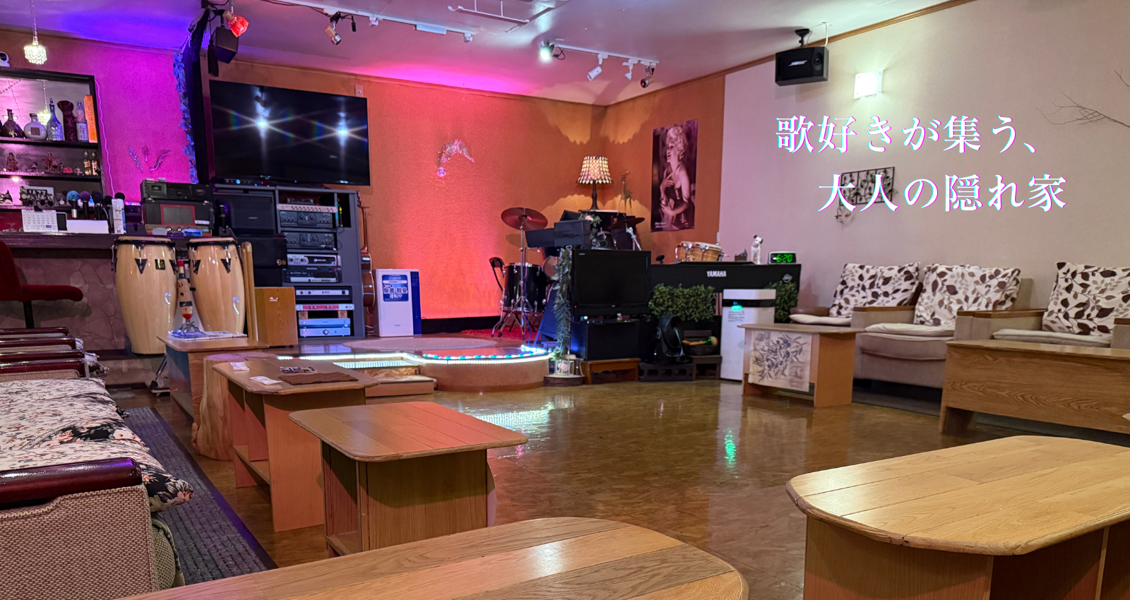 「カラオケ マイ・ルームK」は、ボックス型とは異なる“サロンスタイル”のカラオケ店です。